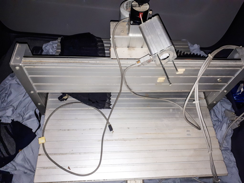 The machine is branded as a Torcam (not Tormach!) ~ 24″ x ~ 24″ x ~ 3″ (X / Y / Z) Router table. It is constructed out of aluminum extrusions and utilizes linear rails and ball screws. This was the main reason I decided to purchase the machine. Once I saw the linear rails and ball screws (and how little the machine had been used) I was sold. After loading the machine into the Sienna, (yes we did break down and buy a minivan for our family and it has been once of the best loathed decisions we ever made!) I snapped a quick picture of my purchase: